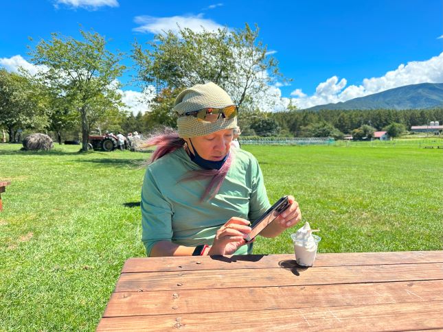 長門牧場のトラクターから望む蓼科山 今日は、上まで登るよ